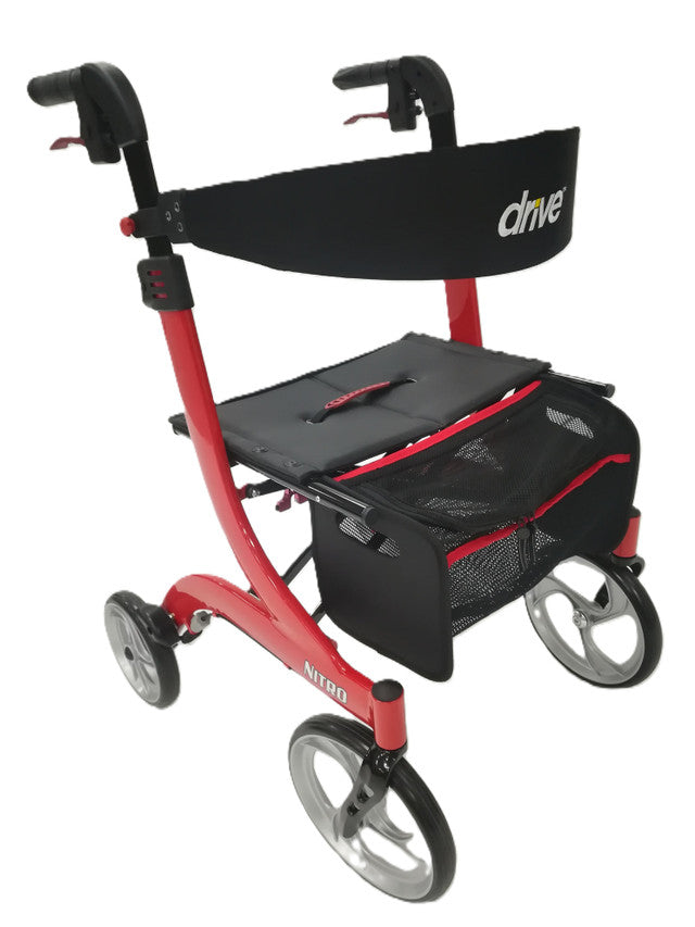 Featuring a sturdy lightweight 8kg aluminium frame with a folding cross-brace design the Nitro Standard Rollator is available in red or black and can accommodate a maximum weight of 136kg.