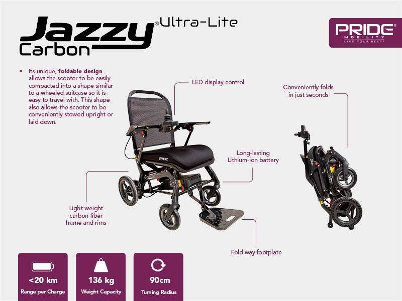 Experience the ultimate in lightweight performance and strength with the Jazzy®Ultra Lite powerchair. Designed for active lifestyles, it features a durable carbon fibre frame that folds down in a few quick motions and is powered by a reliable lithium-ion battery. The Jazzy® Ultra Lite provides effortless mobility and control, combining convenience with lightweight durability.