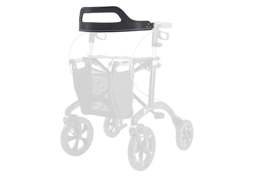 This accessory can be attached to the frame. When sitting on the rollator you can lean against the backrest for a more comfortable rest. The adjustable backrest can remain attached to the frame when you want to fold the rollator.