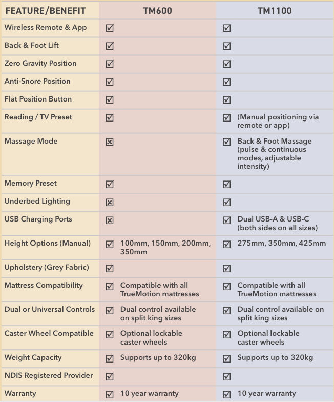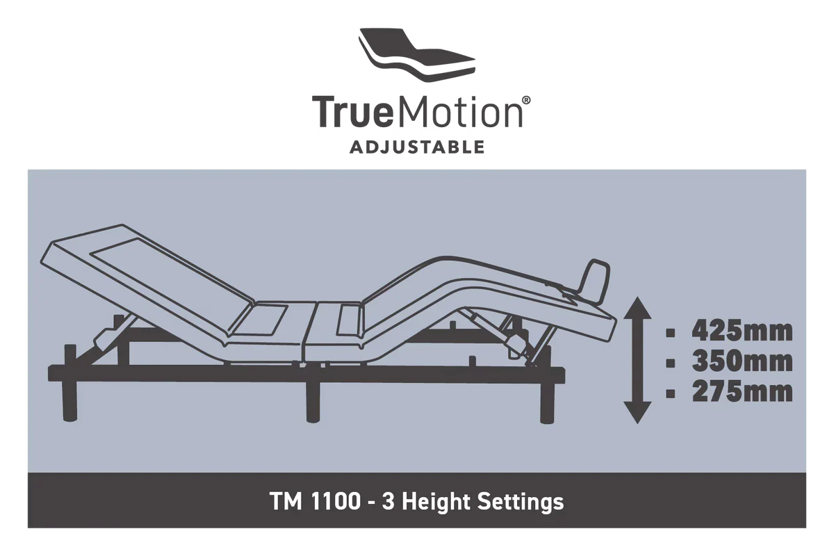 TM1100 by TrueMotion stands out in our premium range - expertly crafted to deliver exceptional comfort, smart features and effortless control tailored for your lifestyle. Whether it’s tailored sleep support, including massage or daily routines like reading or watching TV, the TM1100 adapts seamlessly to you. Enjoy Back and Foot Lift, Zero Gravity, Massage functions, Anti-Snore positioning, Memory pre-set and more - all designed for comfort, made effortless.
